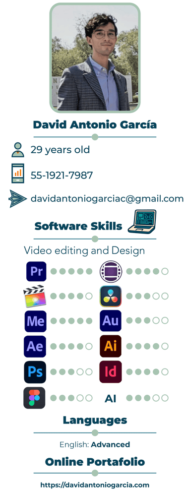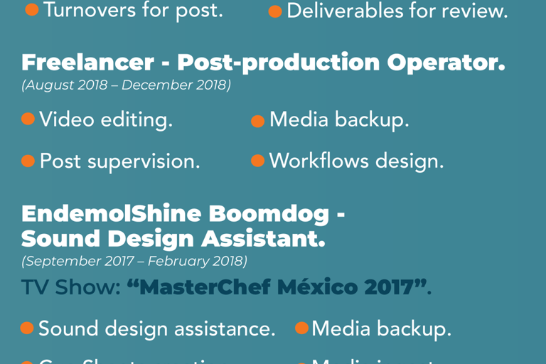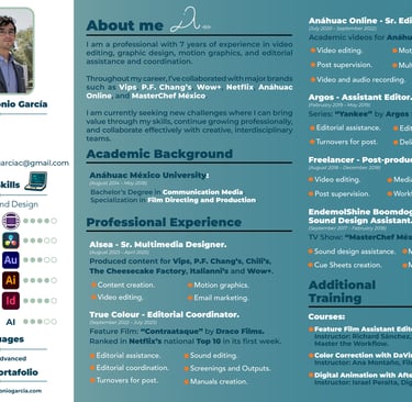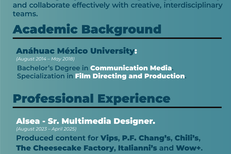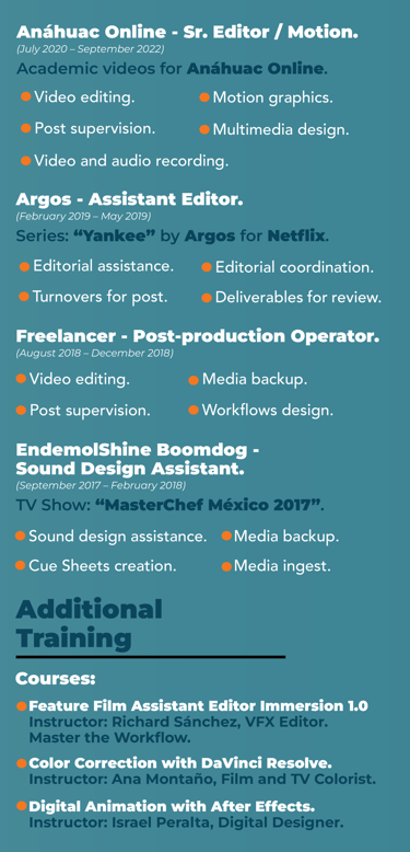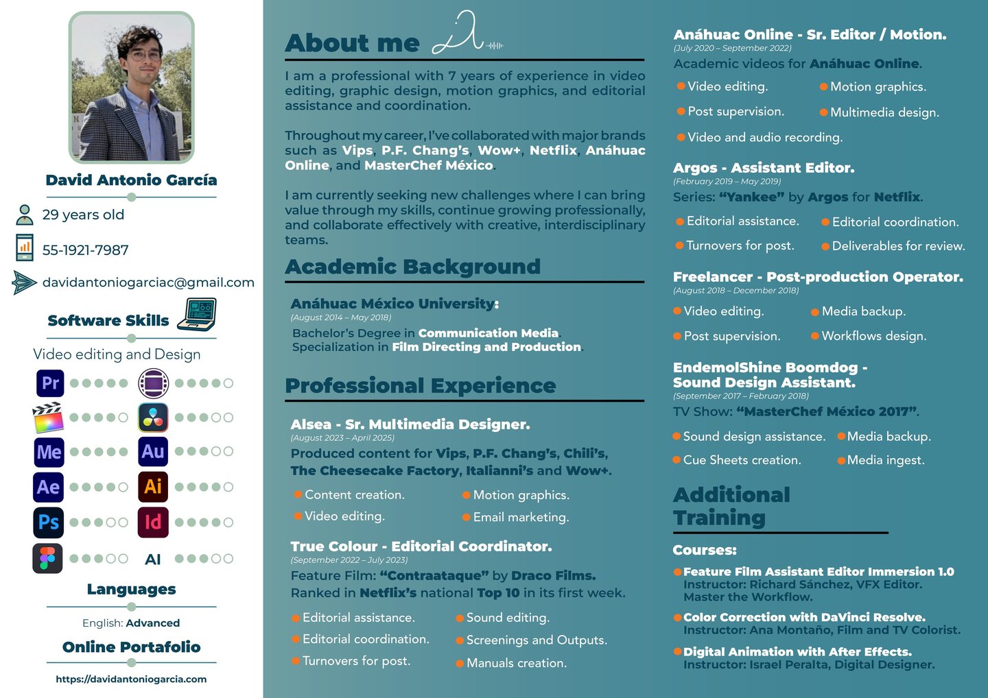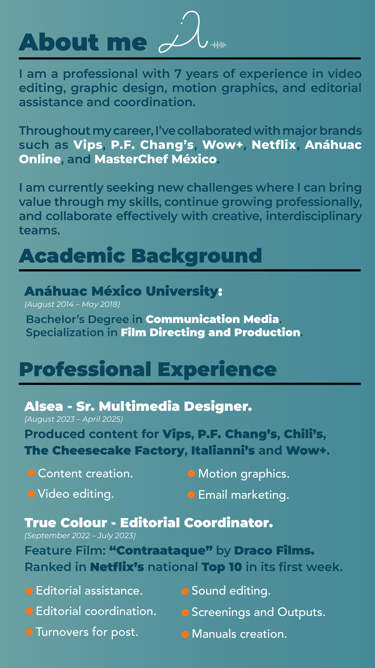 I am a professional with 7 years of experience in video editing, graphic design, motion graphics, and editorial assistance and coordination. Throughout my career, I’ve collaborated for major brands such as Vips, P.F. Chang’s, Wow+, Netflix, Anáhuac Online, and MasterChef México.